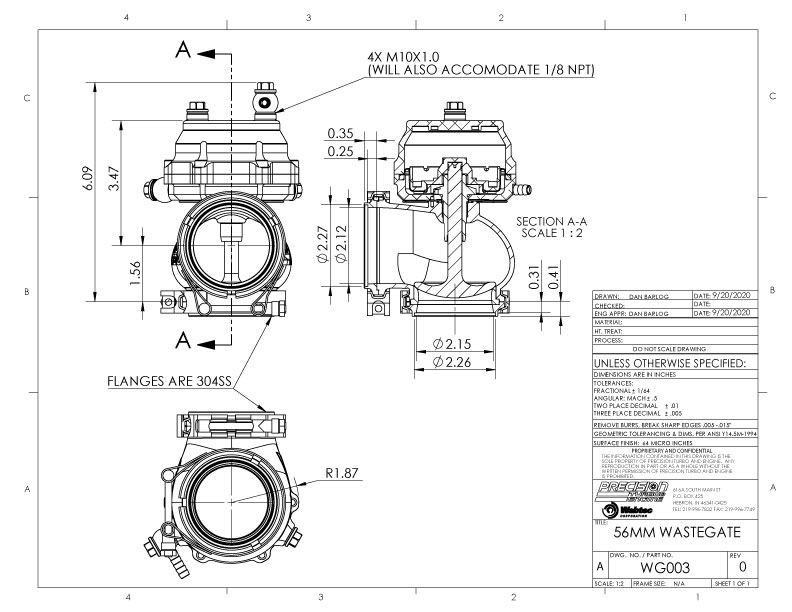 Technical drawing and sizing information for the PTE 56mm external wastegate.