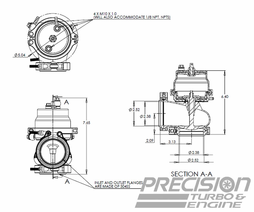 Technical drawing and sizing information for the PTE 66mm PW66 (PBO085-3000) external wastegate.