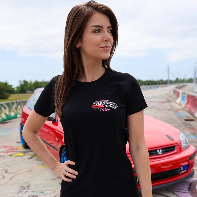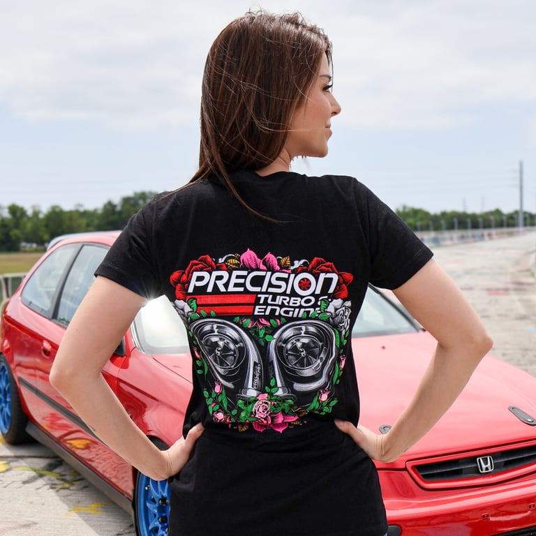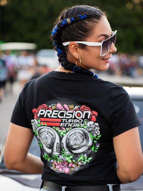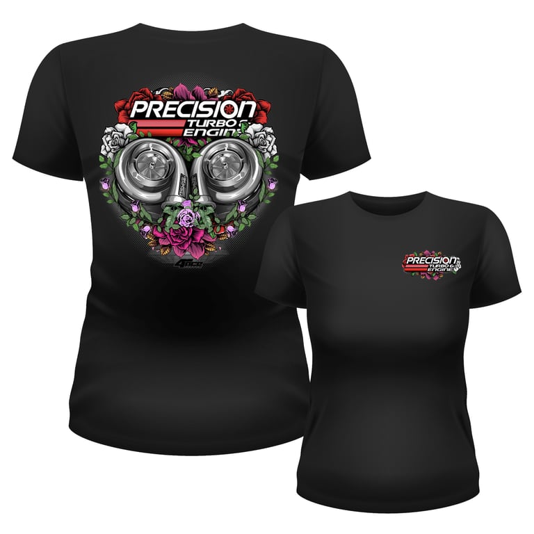 The All-New PTE "Twin Turbo Flower Shirt" This new design is for our women enthusiasts who are passion about turbos and flowers. Available this weekend at the World Cup Finals Import vs Domestic so make sure to grab yours while they last. Comes in a variety of sizes ranging from Small all the way to 2XL. See you guys this weekend!