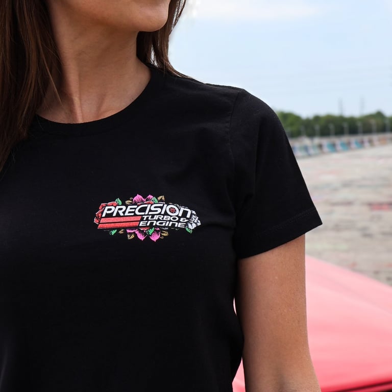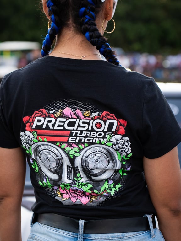 The All-New PTE "Twin Turbo Flower Shirt" This new design is for our women enthusiasts who are passion about turbos and flowers. Available this weekend at the World Cup Finals Import vs Domestic so make sure to grab yours while they last. Comes in a variety of sizes ranging from Small all the way to 2XL. See you guys this weekend!