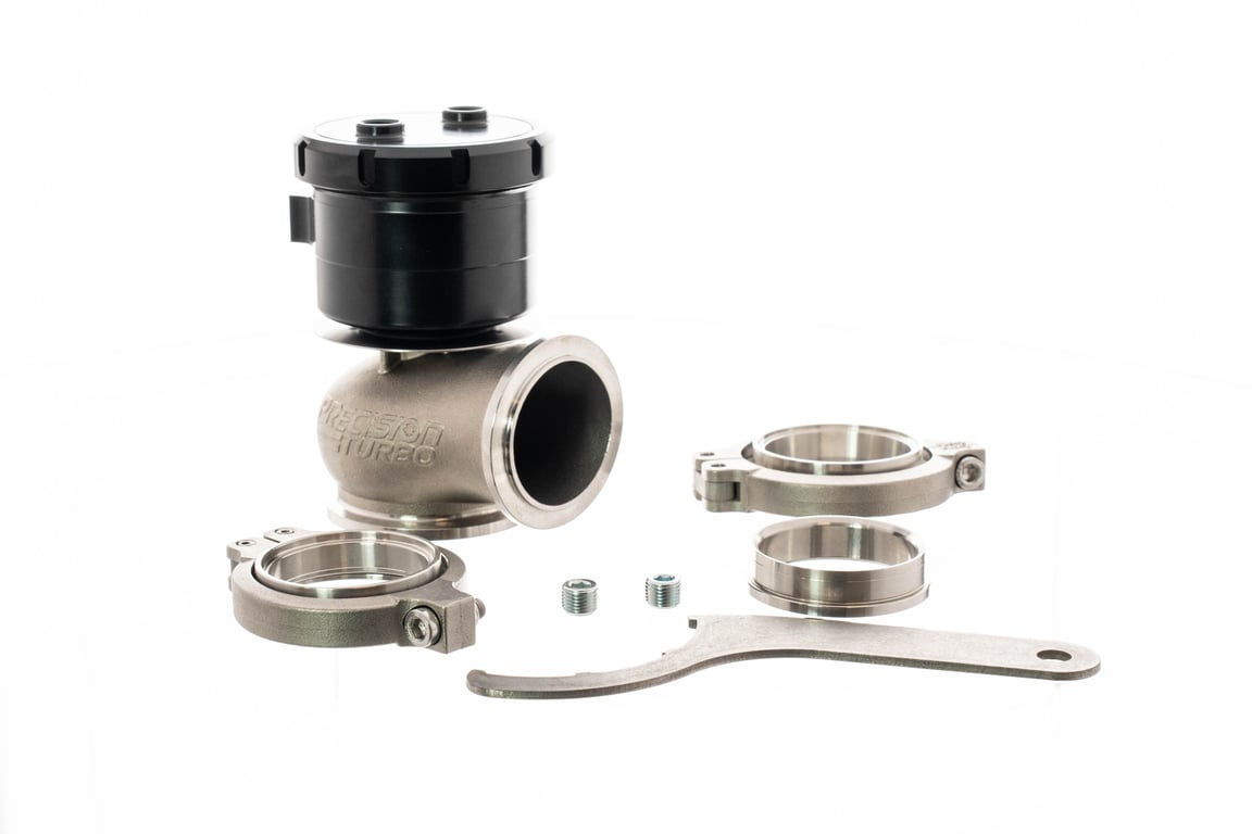 High grade high temperature stainless steel and billet aluminum components for the best in strength, style, and functionality at an affordable price. A 347 stainless investment cast valve body to provide consistent performance without fatigue or failure while also allowing for accurate boost control. An internal Nickel Chromium Alloy Valve 4 individual ports (2 on the bottom can, and 2 on the top can) Comes complete with stainless steel inlet and outlet flanges Unique stabilizing "Precision Pins" which prevent the inlet and outlet flange from spinning All clamps necessary for installation The PTE GEN 2 46MM CO2 piston style wastegate is compatible with most aftermarket manual or electronic boost controllers for ease of use. As a bonus, each Precision Turbo external wastegate is warranted to be free from manufacturers defect for a period of 12 months or 12,000 miles!