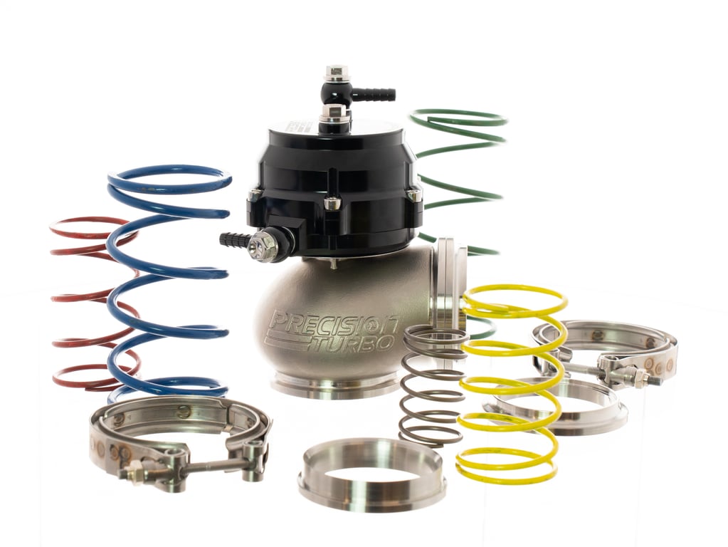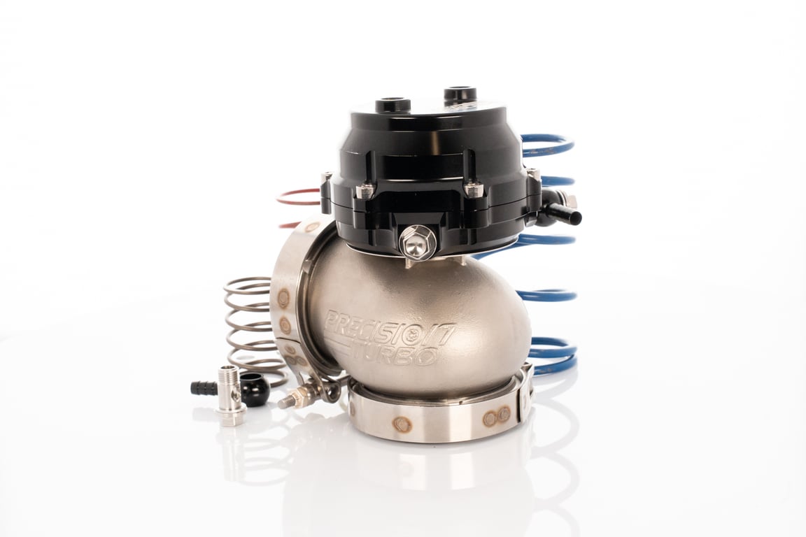 Precision Turbo and Engine's high-quality yet economical GEN2 PW56 56mm external wastegate is perfect for the automotive enthusiast looking to get the most from their turbocharged car, truck or any other vehicle. The 56mm Precision Turbo and Engine GEN2 PW56 external wastegate is fully adjustable and features the following: High grade, high temperature stainless steel and billet aluminum components for the best in strength, style and fucntionality at an affordable price A 347 stainless investment cast valve body to provide consistent performance without fatigue or failure while also allowing for accurate boost control An internal Nickel Chromium Alloy Valve 5 different 17-7 precipitation hardened springs for further adjustment of boost levels Standard clamp-style flange configuration for easy mounting A satin black anodized finish with 6061 aluminum billet cap with two ports to support various installation configurations All clamps necessary for installation The PTE GEN2 PW56 external wastegate is designed to be a direct fit replacement for other units on the market and it compatible with most aftermarket manual or electronic boost controllers for ease of use. As an added bonus, all 56mm Precision Turbo GEN2 PW56 wastegates are warranted to be free from manufacturers defect for a period of 12 months or 12,000 miles!
