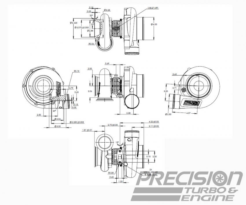 Technical drawing and sizing information for a T3 size air-cooled dual ceramic ball bearing turbocharger with V-band inlet/outlet turbine housing and S compressor cover.