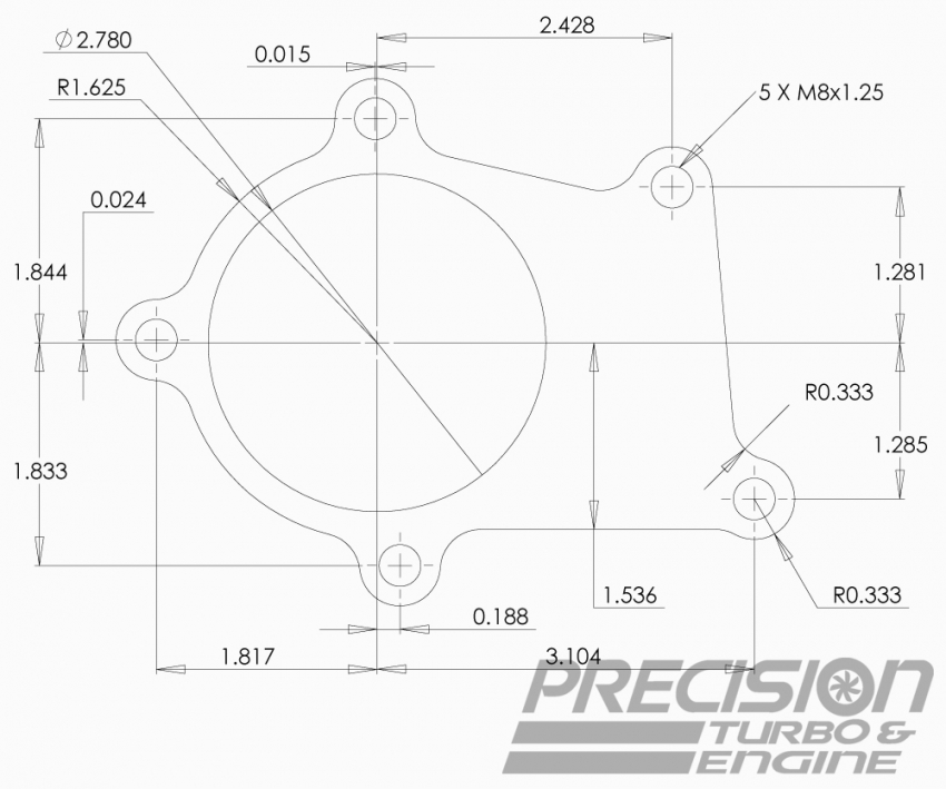 Technical drawing and sizing information for T3 5-Bolt Turbine Discharge Flanged turbochargers.