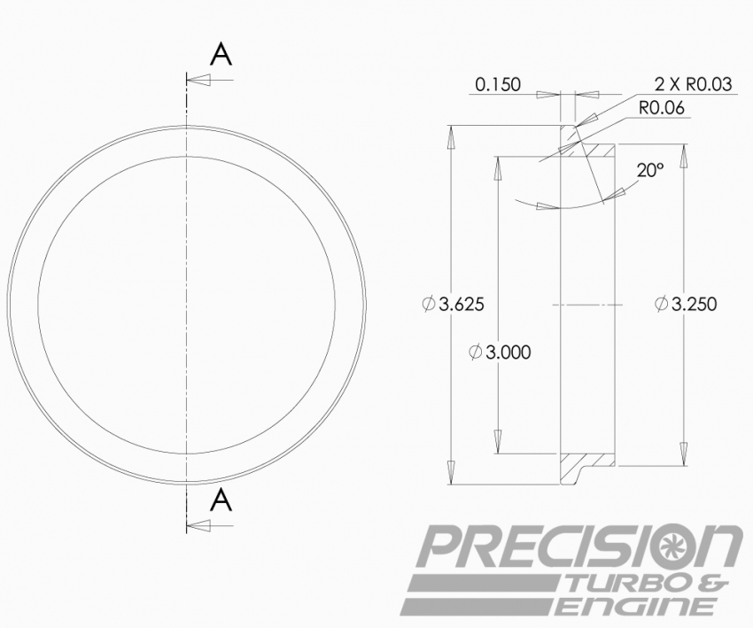 Technical drawing and sizing information for T4 V-Band Turbine Discharge Flanged turbochargers.