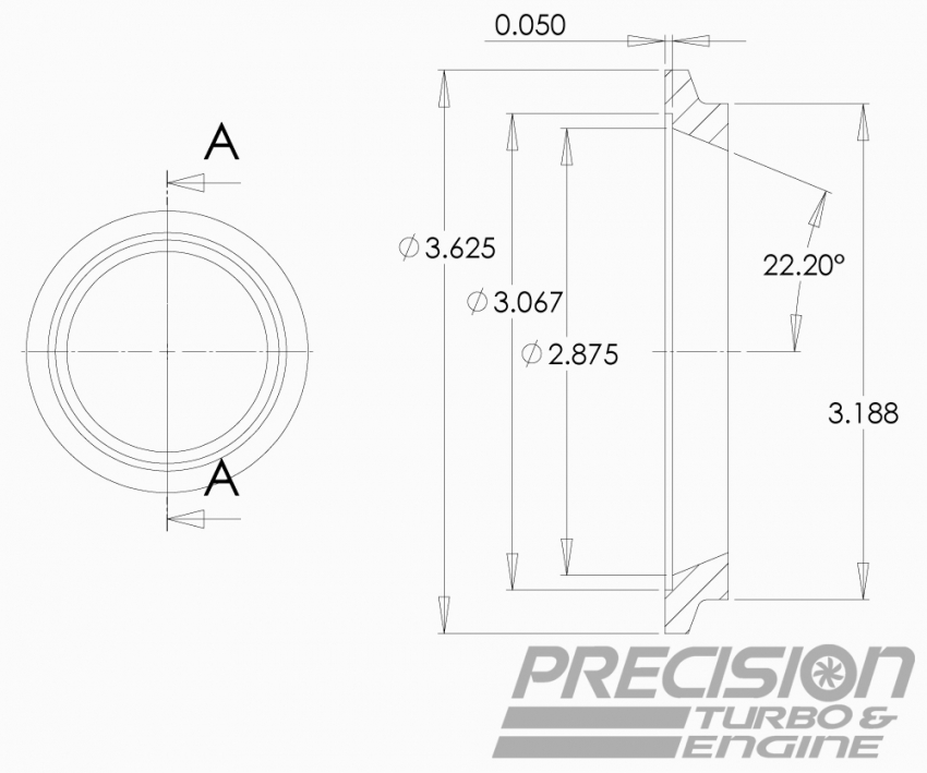 Technical drawing and sizing information for THV Turbine Discharge Flanged turbochargers.