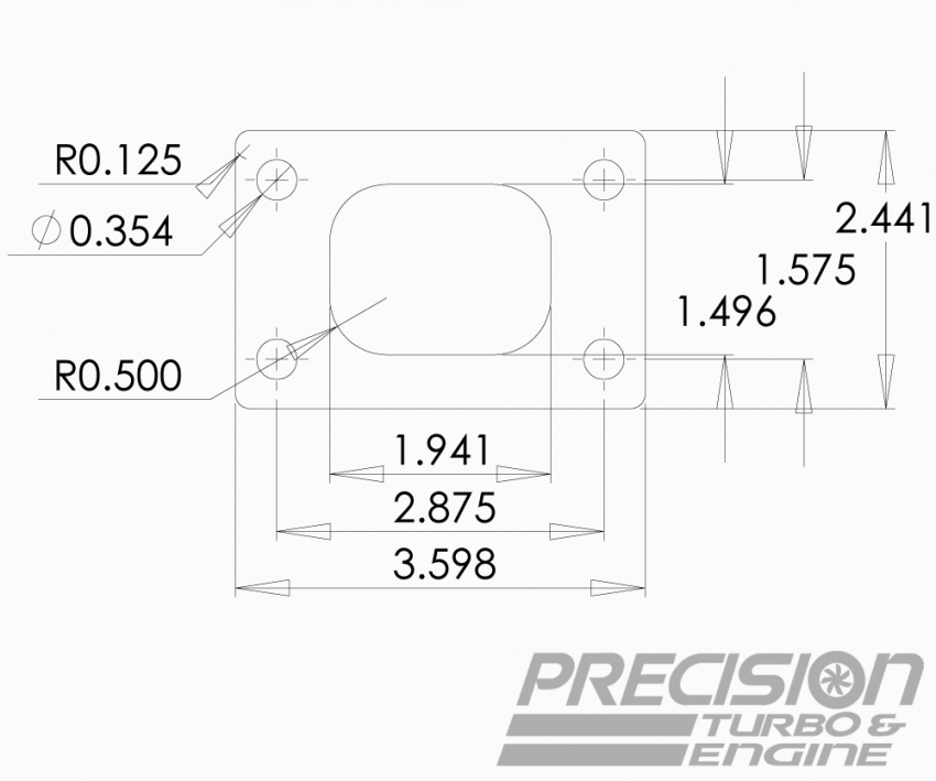 Technical drawing and sizing information for T25 Inlet Flanged turbochargers.